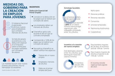Como los otros incentivos, este programa está disponible solo para jóvenes por encima de la mayoría de edad, pero por debajo de 28 años. Según Karla Escobar, directora de derecho laboral en Cáez Muñoz Mejía, esta normativa fue expedida a través del Decreto 688 del 24 de junio de 2021, con el que el Gobierno busca otorgar un aporte mensual que corresponda a 25% de un salario mínimo mensual legal vigente ($227.131) por cada trabajador adicional que vinculen los aportantes.