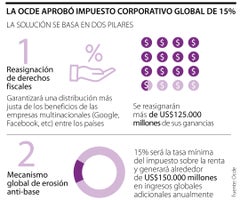 El principal cambio en la política fiscal se da con la imposición de la tasa corporativa mínima, de 15%, que también obliga a las empresas a pagar impuestos donde operan, no solo donde tienen su sede. Se reasignarán más de US$125.000 millones de beneficios. El acuerdo se basa en dos pilares fundamentales; el primer pilar buscará garantizar “la distribución más justa de los beneficios y los derechos fiscales entre los países con respecto a las empresas multinacionales más grandes, incluidas las empresas digitales”, dice la Ocde.